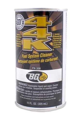 BG 44K fuel system cleaner, added to gasoline, quickly and effectively cleans the entire fuel system, including fuel injectors, intake valves, ports and combustion chambers. Because it provides efficient removal of upper engine deposits, BG 44K reduces problems caused by deposit build-up such as engine surge, stalling, stumble, hesitation and power loss. BG 44K quickly restores engine performance and improves driveability. It will provide quick clean-up of coked fuel injectors and corrosive deposits on the fuel sending unit. It is compatible with all fuel system materials, alcohol-blended fuels, common fuel additives. Contains no alcohol. Catalytic converter, and oxygen sensor safe.