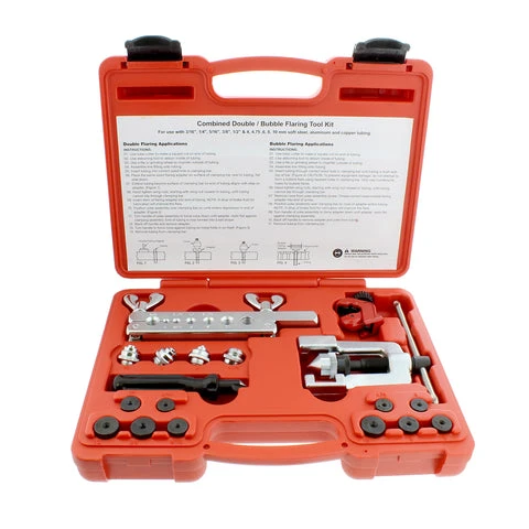 - MAKE DOUBLE & BUBBLE FLARES: The ABN Double Flare Kit & Bubble Flaring Tool create flares for bending brake and fuel pipes, lines, braking pipe repairs, water, gas, refrigeration, and more; Fixed head and angles make clean, precise flares; Yoke type compressor with T-bar handle for firm grip; Cone for accurate alignment; For 3/16″, 1/4″, 5/16″, 3/8″, 1/2”, 4mm, 4.75mm, 6mm, 8mm, 10mm steel, aluminum, and copper tubing; Adapters included