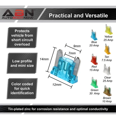 - Contents: Choose between an assortment of mini fuses, an assortment of low profile mini fuses. or an assortment of standard fuses; All assortments have 7 common fuse sizes that include (10) pieces of 5 Amp – Tan, (10) 7.5 Amp – Brown, (20) 10 Amp – Red, (20) 15 Amp – Blue, (20) 20 Amp – Yellow, (20) 25 Amp – Clear, (20) 30 Amp – Green