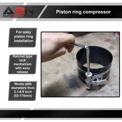 - EASY PISTON RING INSTALLATION: The ABN 3” Inch Piston Ring Compressor is a ratchet-type lock mechanism with fingertip easy release thumb switch lever, hex spanner, and adjustable safety screws to allow for safe and quick install of piston rings by simple ring compression; Not intended for expanding piston rings