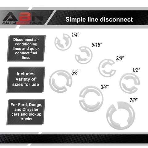 - SIMPLE LINE DISCONNECTION: Use the ABN Automotive SAE Air Conditioner & Fuel Line Quick Disconnect 7pc Tool Kit – Plastic Auto AC / Gas Set 1/4 – 7/8” Inch to quickly and easily disconnect air conditioning lines and quick connect fuel lines; If you are replacing or repairing the A/C or fuel line on your car or truck, the connectors require these tools